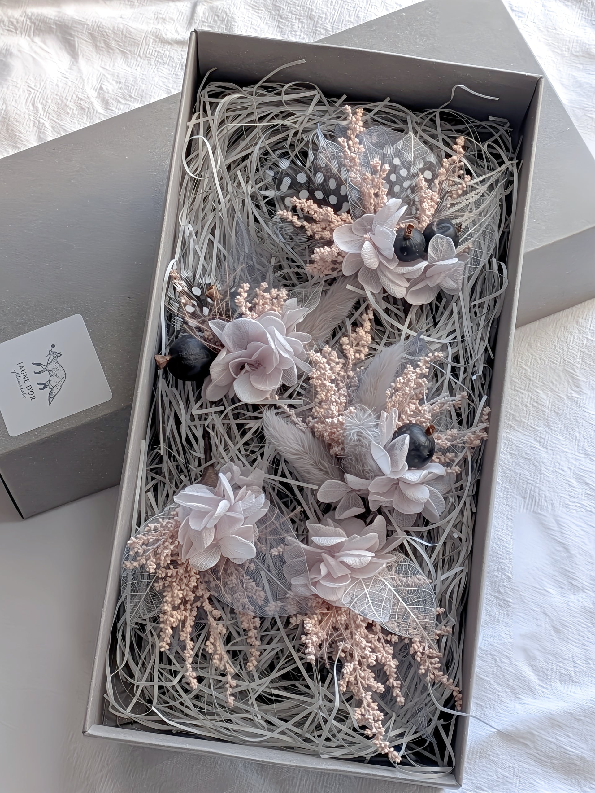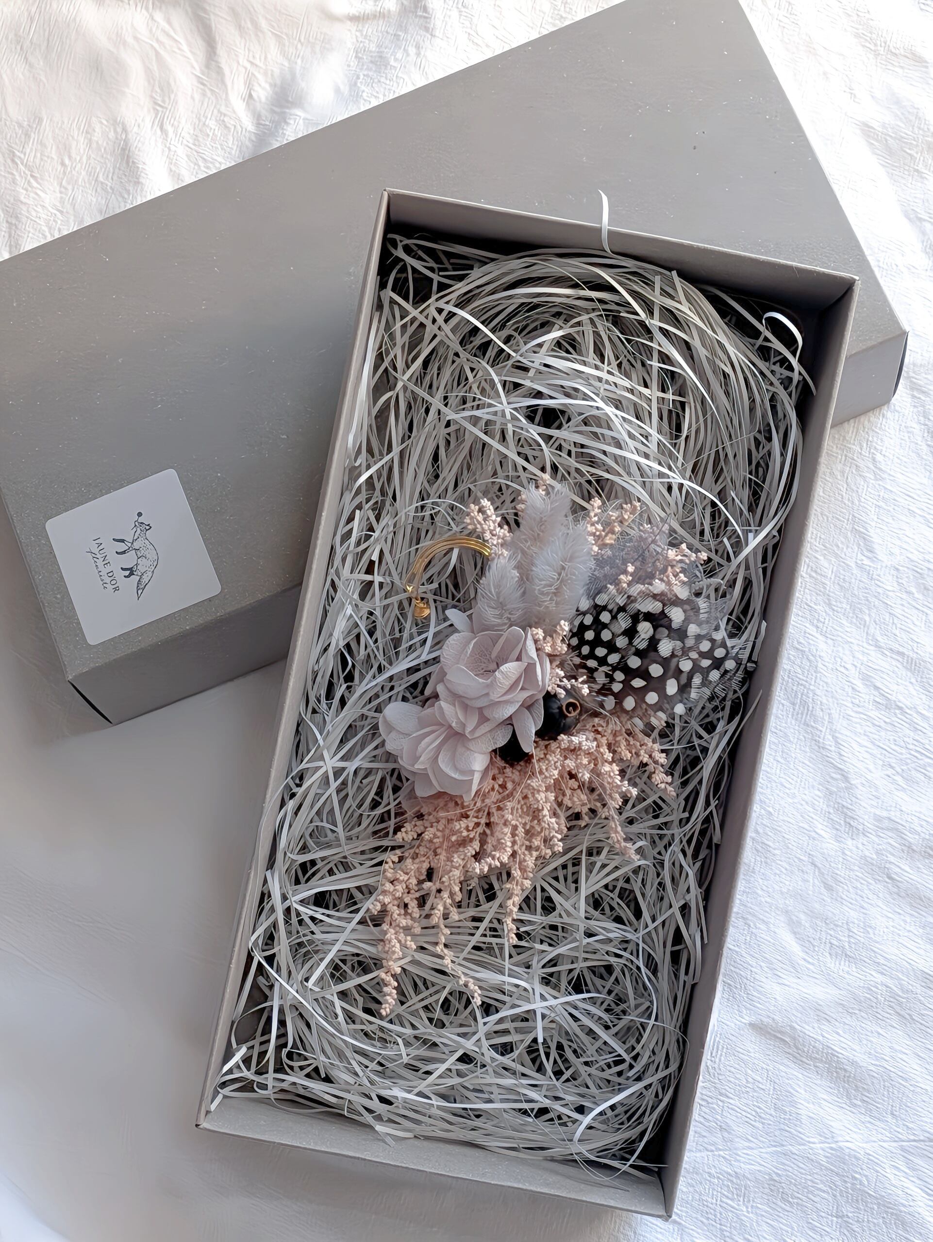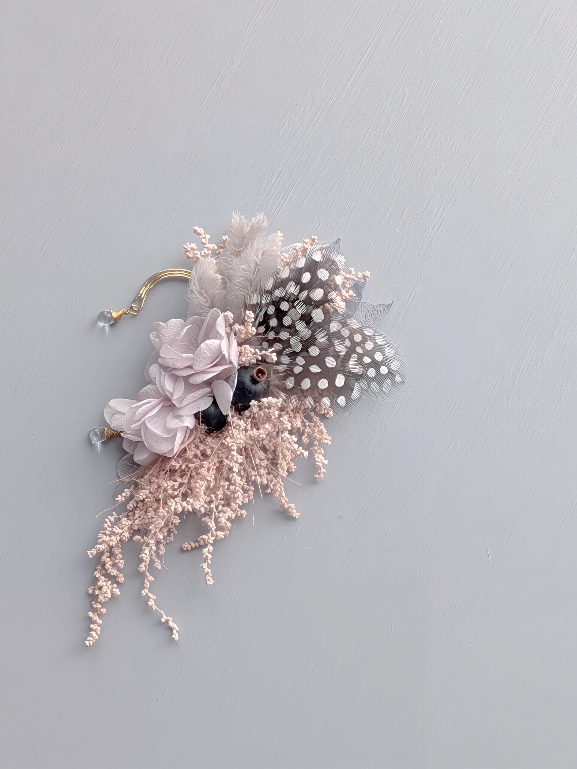 ドライフラワーやプリザーブドフラワー、フェザーや木の実などお入れしてお作りしています。自然素材ならではの繊細な雰囲気をお楽しみください。ブライダル、卒業式など、特別な1日にもおすすめです。